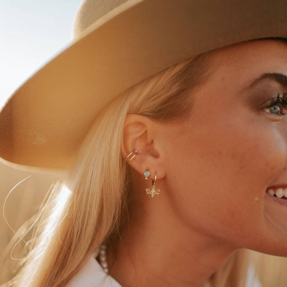 Dainty gold bee huggies. High quality gold vermeil (gold plated sterling silver). Hypoallergenic and good for sensitive skin.