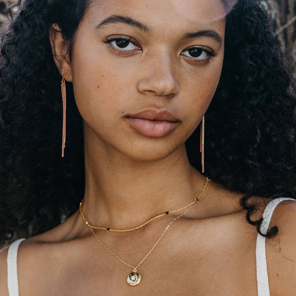 Small round locket with Czech crystal on 20" fine chain, made of brass with a 14k gold plate. Designed and assembled in our Sonoma, CA studio.
