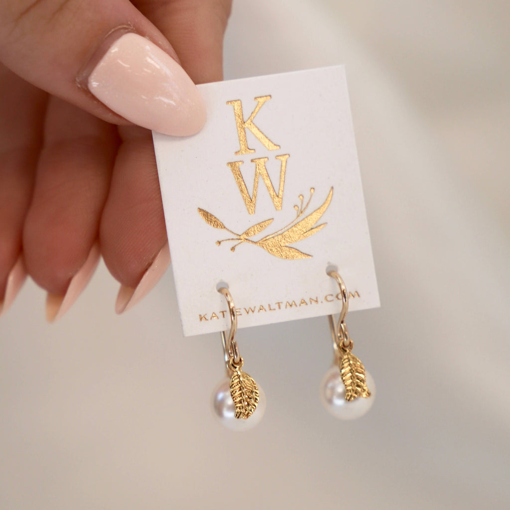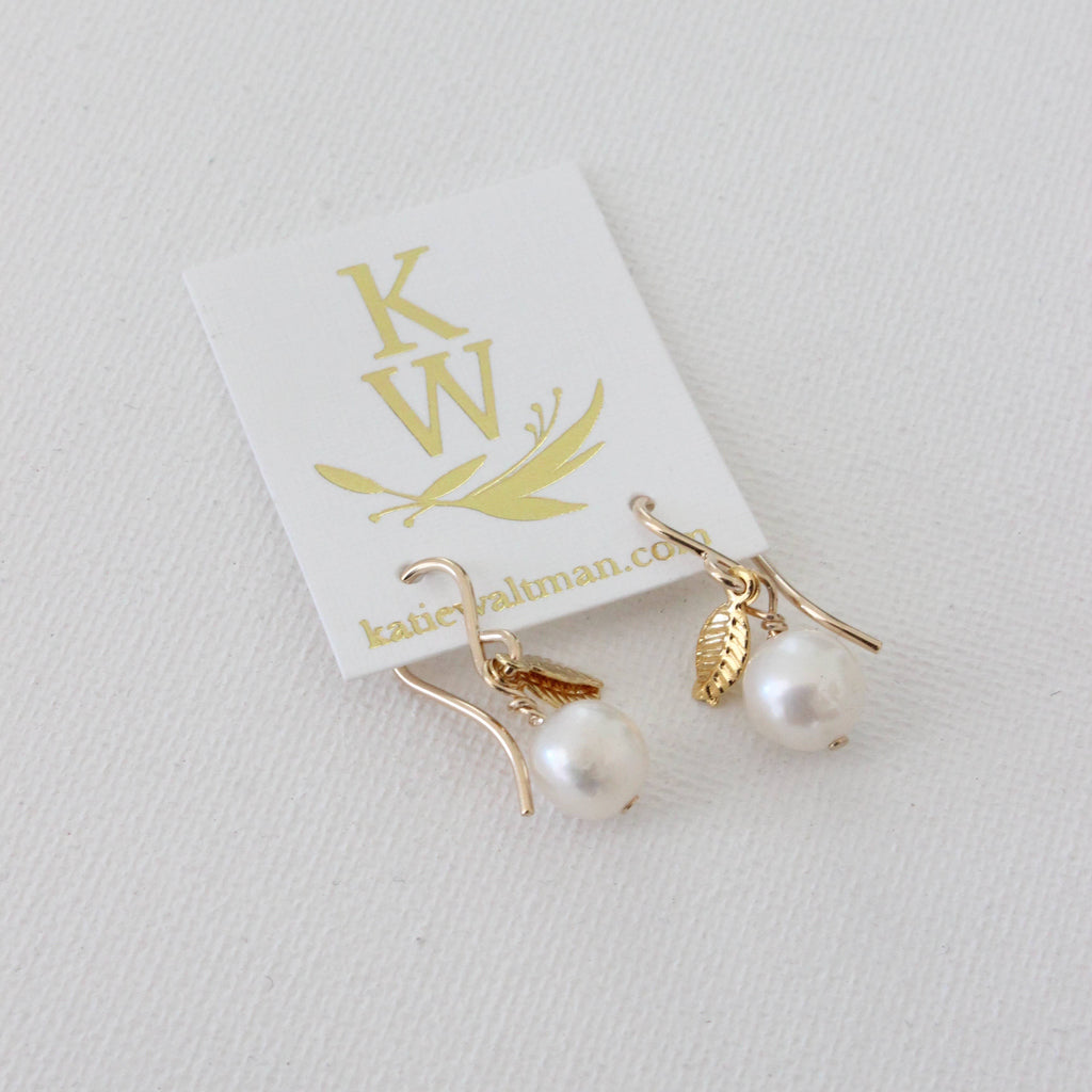 Small round white fresh-water pearl on our simple gold filled earwires with gold leaf accents.