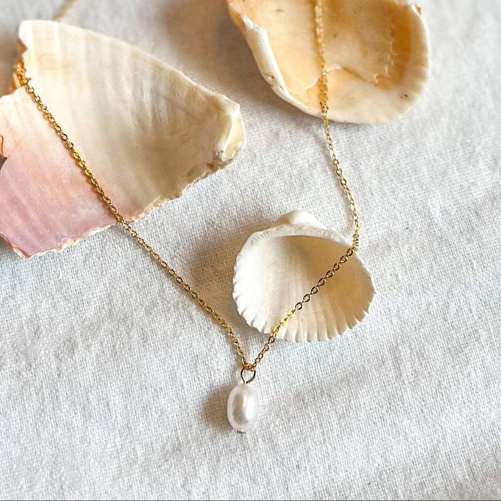 Introducing the Dainty Pearl Necklace! This simple necklace features a gorgeous natural freshwater pearl drop suspended from an 18-inch stainless steel chain with luxurious 18k gold plating.