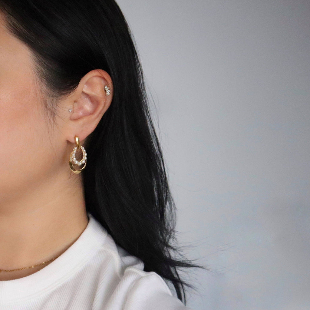 Featuring a unique dual-hoop design, the smaller inner hoop is adorned with delicate pearl details that add a timeless charm.