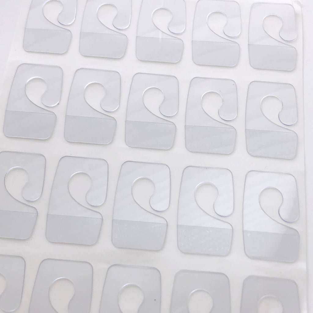 J Hook hang tabs to adapt your cards for display. Plastic J-Hook, 1 3/8" by 7/8", with 5/16" hole with adhesive backing. Note that products will not be returnable with hang tabs attached. Must be ordered in increments of 10. tags: J-hooks, Hang Tags, J hooks, J-hook